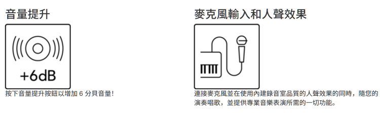 多種連接選項,提供練習、演奏和表演所需的所有支援。插入麥克風,可一邊演奏一邊嘗試唱歌,使用 Rec'n'Share 應用程式與大家分享您的音樂,並連接到 PA 系統,讓您在舞台上表演。