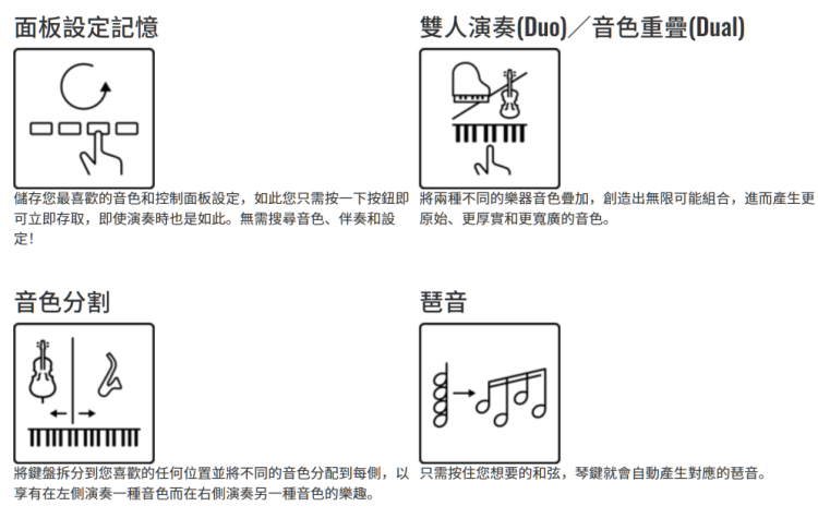 ・ 音軌開/關:透過靜音或取消靜音預設伴奏風格的各別段落,完美形塑樂音。無需切換伴奏風格,樂曲各部分間可流暢過渡,打造出充滿活力和音樂表現力的表演。